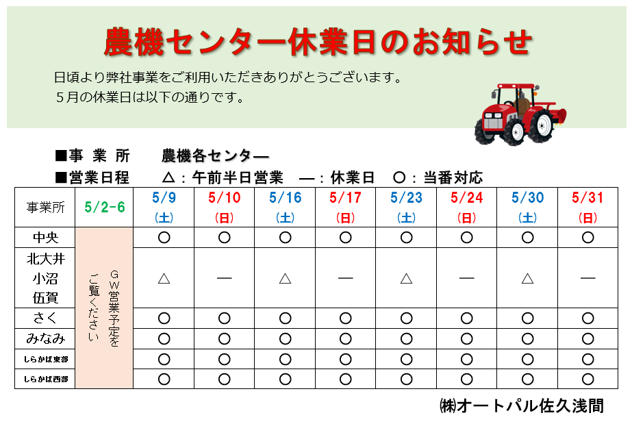 農機センター5月休業日のお知らせ